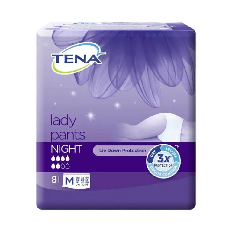 TENA Lady Pants Night ist baumwollweiche Einweg-Schutzunterwäsche mit DREIFACHSCHUTZ vor Auslaufen, Feuchtigkeit und Gerüchen. Mit dem hohen, schmalen Bündchen, integrierten Auslaufbarrieren und atmungsaktivem Material sehen TENA Lady Pants Night nicht nur aus wie herkömmlich Unterwäsche, sondern fühlen sich auch so an und bieten zugleich absolute Sicherheit für die Nacht.