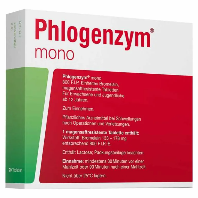 Phlogenzym® mono ist ein pflanzliches Arzneimittel, welches bei Schwellungen nach Operationen oder Verletzungen eingesetzt wird. Der in Phlogenzym® mono enthaltene Wirkstoff Bromelain wirkt dabei von innen heraus abschwellend. Phlogenzym mono ist gut verträglich und sanft zu den Schleimhäuten.