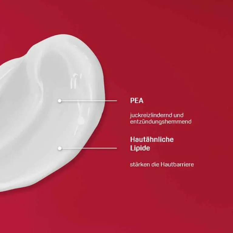 Durch einen hautberuhigenden Wirkkomplex aus hautverwandten Lipiden und Palmitoylethanolamin (PEA) lindert die Creme Juckreiz und Rötungen, zudem wird die Haut natürlich und sanft gepflegt.