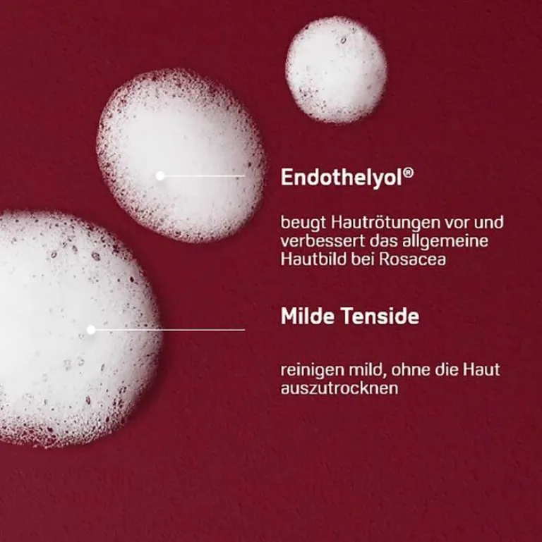 Der Reinigungsschaum enthält den Wirkkomplex Endothelyol®, der zur Vorbeugung von Hautrötungen und Verbesserung des allgemeinen Hautbildes bei Rosacea beiträgt.