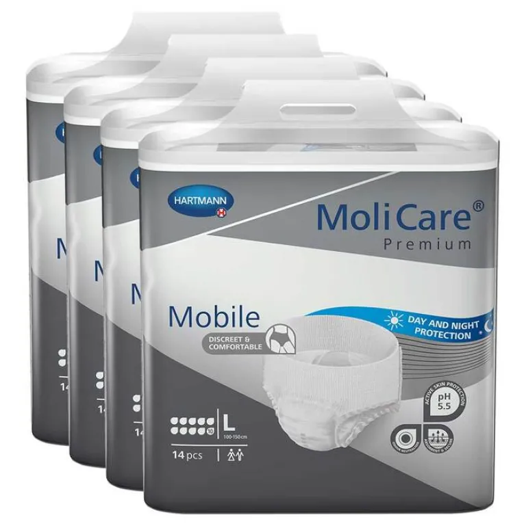 MoliCare® Premium Mobile 10 Tropfen sind für Personen mit sehr schwerer Harn- und Stuhlinkontinenz geeignet. Wie alle Pull-up-Hosen kann diese Inkontinenzunterhose wie normale Unterwäsche getragen werden und ist besonders für die Nacht geeignet.