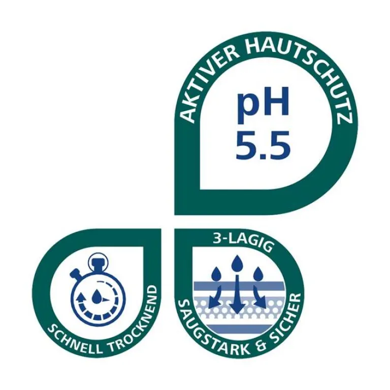 - Zuverlässig und sicher durch flüssigkeitsabweisende Innenbündchen und einen Nässeindikator, der den optimalen Wechselzeitpunkt anzeigt