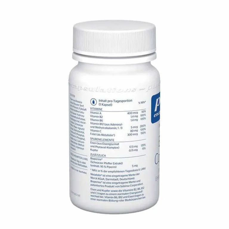 Eisen Complex von Pure Encapsulations enthält gut bioverfügbares Eisen (Eisenglycinat) sowie pflanzliches Eisen aus dem Phytavail-Komplex, welcher aus braunem Senf (Brassica juncea) gewonnen wird. Dieser speziell kultivierte Senf ist reich an natürlichem Eisen. Eisen Complex ist besonders effektiv, da auch die unterstützenden Co-Faktoren enthalten sind.
