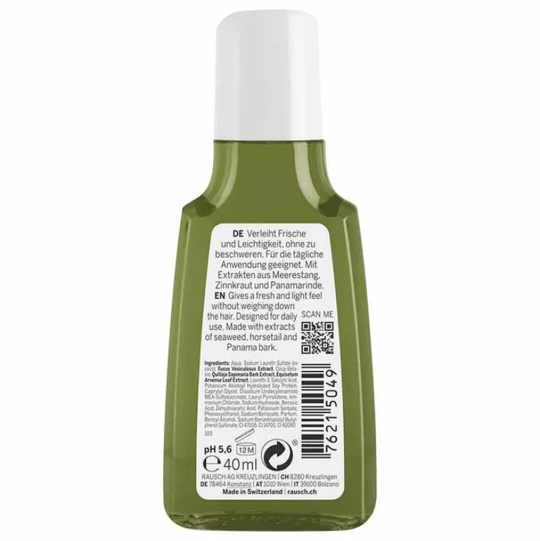 Für den Helfer in der Not bei fettigem Haar haben die Rausch Expertinnen in Kreuzlingen am Bodensee die besten Inhaltsstoffe aus der Natur ausgesucht. Das Shampoo besteht zu 89 % aus Inhaltsstoffen natürlichen Ursprungs, davon 40 % aus wertvollen hauseigenen Extrakten wie Panamarinde, Zinnkraut aus Wildsammlung und Meerestang. Wohl auch deshalb versprüht das Shampoo mit dem kräutrig-würzigen Duft einen frischen Hauch von Meeresbrise unter der Dusche.