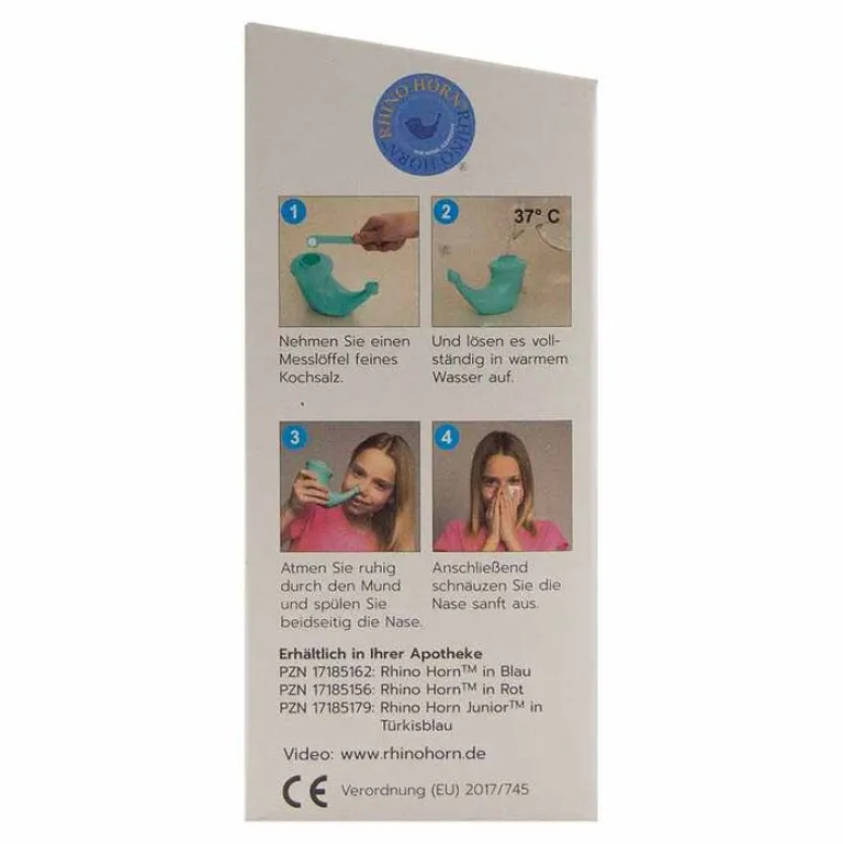 Rhino Horn Junior™ ist eine Nasendusche, die speziell für Kinder im Alter von 4–12 Jahren designed wurde. Rhino Horn Junior™ entspricht rund 2/3 der Erwachsenengröße und passt gut in Kinderhände. Es hat einen längeres und dünneres, konisches Nasenansatzstück, das sich optimal an die kleineren Naseneingänge von Kindern anpasst.