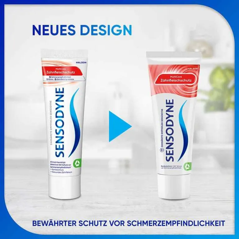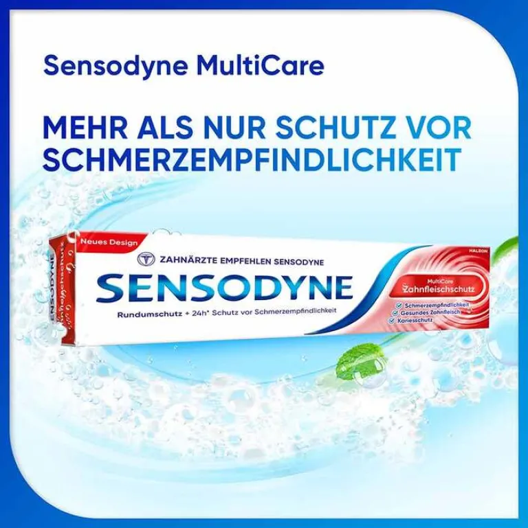 Sensodyne MultiCare Zahnfleischschutz ist eine tägliche Zahncreme, die klinisch bestätigt 24h Schutz vor Schmerzempfindlichkeit* bietet und bei regelmäßigem Zähneputzen dazu beiträgt, Zahnfleischproblemen vorzubeugen.