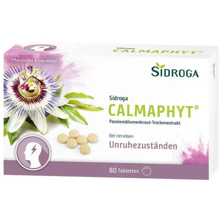 Sidroga CALMAPHYT® Überzogene Tabletten. Wirkstoff: Passionsblumenkraut-Trockenextrakt. Anwendungsgebiete: pflanzliches Arzneimittel zur Beruhigung bei nervösen Unruhezuständen bei Erwachsenen und Jugendlichen ab 12 Jahren. Zu Risiken und Nebenwirkungen lesen Sie die Packungsbeilage und fragen Sie Ihre Ärztin, Ihren Arzt oder in Ihrer Apotheke. Sidroga GfGmbH, 56130 Bad Ems