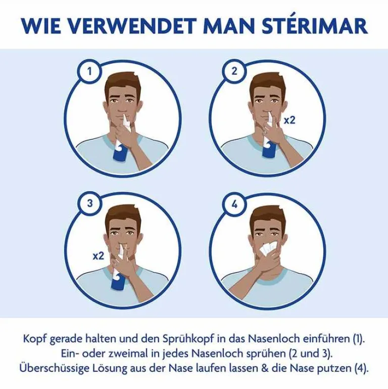 Den Kopf zur Seite neigen, den Sprühkopf in das obere Nasenloch einführen und für 2 bis 3 Sekunden gedrückt halten. Überschüssige Lösung aus dem anderen Nasenloch laufen lassen und dann die Nase putzen. Nach jedem Gebrauch den Sprühkopf mit heißem Wasser reinigen.