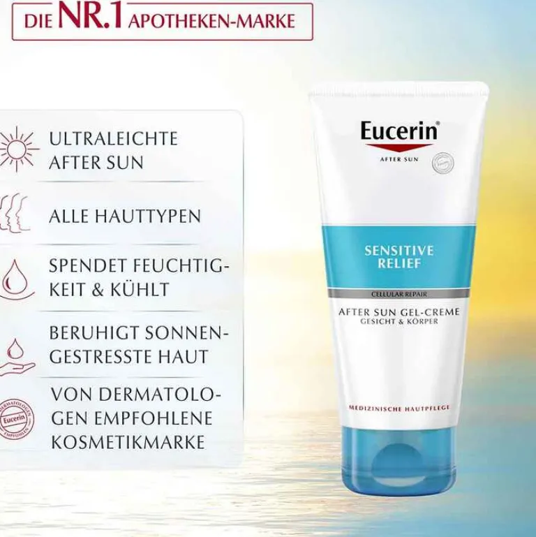 Die Eucerin After Sun Sensitive Relief Gel-Creme ist eine ultraleichte Hautpflege nach dem Sonnenbad für den ganzen Körper und das Gesicht. Die Apres Sun Lotion mit CELLULAR REPAIR TECHNOLOGY kühlt die Haut sofort und beruhigt langanhaltend. Mit der kühlenden Bodylotion wird die Haut dabei mit Feuchtigkeit versorgt und Spannungsgefühle werden gemildert.