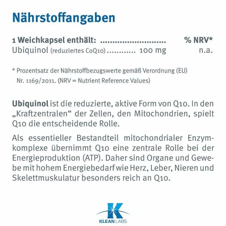 Trägerstoff D-Limonen, Kapselhülle Weichkapsel (Gelatine, Glycerin, Wasser), Ubiquinol (reduziertes CoQ10), Antioxidationsmittel Caprylsäure, Antioxidationsmittel Caprinsäure, Farbstoff flüssiger Karamell, Alpha-Liponsäure.