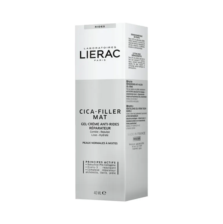 Die Cica-Filler Gel-Creme ist eine tägliche Pflege gegen alle Arten von Falten: Mimikfalten, Alterungsfalten, Dehydrierungsfalten und UV-bedingte Falten.Es hat eine reparierende Anti-Falten Wirkung dank einer hohen Konzentration an aufpolsternder Hyaluronsäure und Bakuchiol Pro-Kollagen. Dieser neue Wirkstoff ist effizienter als Retinol ohne dabei die unerwünschten Nebenwirkungen aufzuweisen. Für eine optimale Wirksamkeit haben die Laboratoires LIERAC ihren bewährten Komplex aus Frauenmantel, Efeu und Schachtelhalm integriert, der für seine elastizitätsfördernden Eigenschaften für die Haut bekannt ist. Ein zusätzlich hinzugefügter porenverfeinender Wirkstoff wirkt zudem gezielt gegen vergrößerte Poren bei einer Mischhaut. Ein angenehmer, blumiger und femininer Duft mit einem Hauch von Jasmin, grünem Apfel und Rosenholz vermitteln einen Eindruck von Frische.