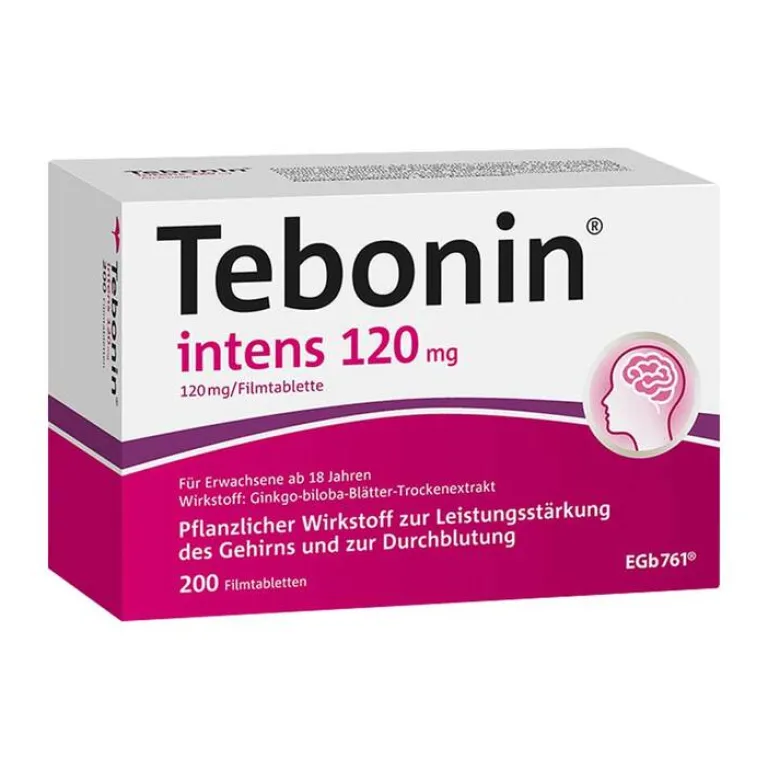 Tebonin® intens 120 mg. Wirkstoff: Ginkgo-biloba-Blätter-Trockenextrakt. Anwendungsgebiete: Zur symptomatischen Behandlung von hirnorganisch bedingten geistigen Leistungseinbußen im Rahmen eines therapeutischen Gesamtkonzeptes bei fortschreitender Abnahme bzw. Verlust erworbener geistiger Fähigkeiten mit den Hauptbeschwerden: Gedächtnis-/ Konzentrationsstörungen, Niedergeschlagenheit, Schwindel, Ohrensausen, Kopfschmerzen. Bevor die Behandlung begonnen wird, sollte geklärt werden, ob die Beschwerden nicht auf einer spezifisch zu behandelnden Grunderkrankung beruhen. Zur Verlängerung der schmerzfreien Gehstrecke bei arterieller Verschlusskrankheit in den Gliedmaßen, sog. „Schaufensterkrankheit“ im Rahmen physikalisch-therapeutischer Maßnahmen, insbes. Gehtraining. Bei Schwindel infolge von Durchblutungsstörungen oder altersbedingten Rückbildungsvorgängen. Zur unterstützenden Behandlung von Ohrgeräuschen infolge von Durchblutungsstörungen oder altersbedingten Rückbildungsvorgängen. Häufig auftretende Schwindelgefühle und Ohrensausen bedürfen grundsätzlich der Abklärung durch eine Ärztin oder einen Arzt. Bei plötzlich auftretender Schwerhörigkeit bzw. einem Hörverlust sollte unverzüglich eine Ärztin oder ein Arzt aufgesucht werden. Zu Risiken und Nebenwirkungen lesen Sie die Packungsbeilage und fragen Sie Ihre Ärztin, Ihren Arzt oder in Ihrer Apotheke. Dr. Willmar Schwabe GmbH & Co. KG – Karlsruhe