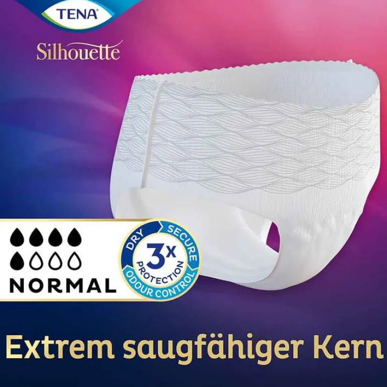 Um sich in jeder Situation sicher und wohlzufühlen, ist es wichtig auf ein Produkt vertrauen zu können, das bei Inkontinenz rundum diskreten und sicheren Schutz leistet. TENASilhouette Normal Blanc Einweghosen bieten zuverlässigen Auslaufschutz und sehen dabei aus wie normale weiße Unterwäsche. Das sehr saugfähige und atmungsaktive Material bietet eine besonders schnelle Absorption und schließt auslaufenden Urin sicher ein, unerwünschter Geruchsbildung wird dank Fresh Odour Control wirksam vorgebeugt. Die Pants eignen sich für Frauen mit mittlerer bis stärkerer Blasenschwäche.