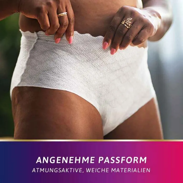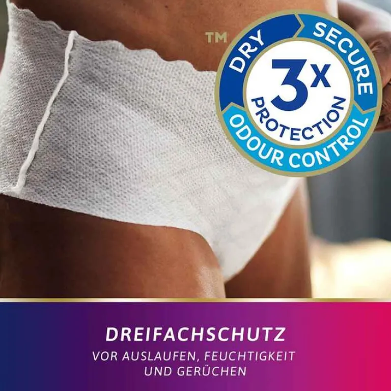 Der sichere Auslaufschutz nimmt Feuchtigkeit genau dort auf, wo es am wichtigsten ist. Das sehr saugfähige und atmungsaktive Material bietet eine besonders schnelle Absorption und schließt auslaufenden Urin sicher ein, unerwünschter Geruchsbildung wird dank Fresh Odour Control wirksam vorgebeugt. Die Einweghöschen eignen sich für Frauen mit mittlerer bis stärkerer Blasenschwäche.