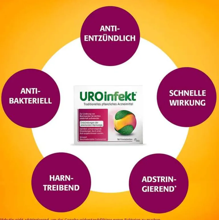 UROinfekt® 864 mg Filmtabletten Wirkstoff: Bärentraubenblätter-Trockenextrakt. Anwendungsgebiete: Traditionelles pflanzliches Arzneimittel zur Anwendung bei Frauen zur Linderung von Beschwerden bei leichten wiederholt auftretenden (rezidivierenden) Entzündungen der ableitenden Harnwege wie Brennen beim Wasserlassen und/oder häufiges Wasserlassen, nachdem schwerwiegende Erkrankungen von einem Arzt ausgeschlossen wurden, ausschließlich auf Grund langjähriger Anwendung. Omega Pharma Deutschland GmbH, Benzstr. 25, 71083 Herrenberg, Deutschland. Zu Risiken und Nebenwirkungen lesen Sie die Packungsbeilage und fragen Sie Ihre Ärztin, Ihren Arzt oder in Ihrer Apotheke.