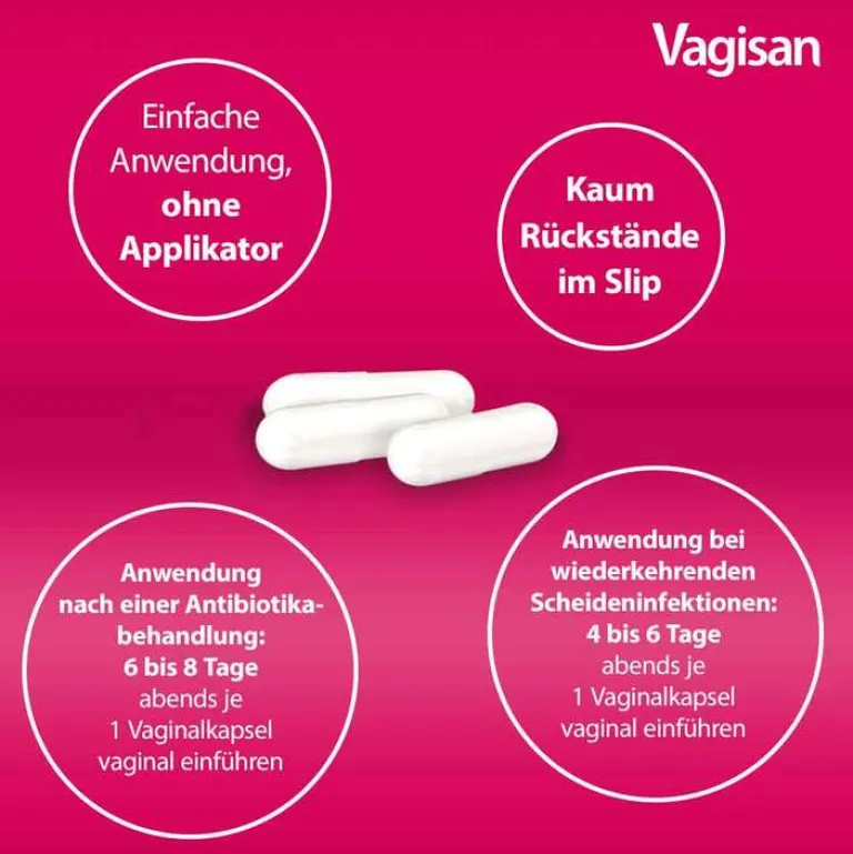 Vagisan ProbioFlora Milchsäure-Bakterien. Anwendungsgebiete: Zur Normalisierung der gestörten Vaginalflora nach Antibiotikabehandlung einer bakteriellen Vaginose (bakterielle Scheideninfektion); zur Aufrechterhaltung der normalen Vaginalflora bei wiederkehrenden Scheideninfektionen. Zu Risiken und Nebenwirkungen lesen Sie die Packungsbeilage und fragen Sie Ihre Ärztin, Ihren Arzt oder in Ihrer Apotheke. Dr. August Wolff GmbH & Co. KG Arzneimittel, Sudbrackstr. 56, 33611 Bielefeld