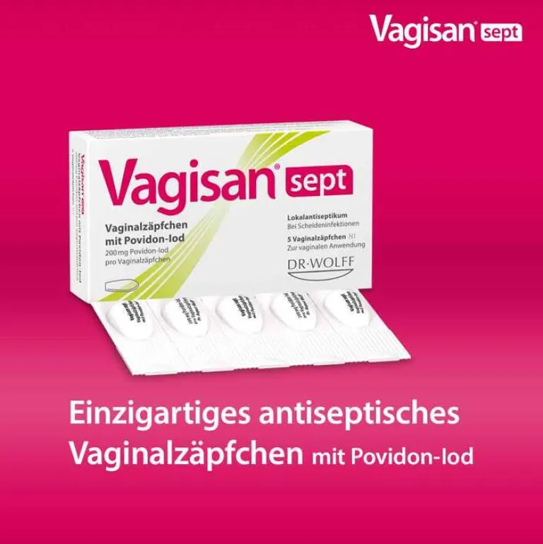 Vagisan sept Vaginalzäpfchen mit Povidon-Iod. Wirkstoff: Povidon-Iod. Anwendung: Iod-empfindliche spezifische und unspezifische Vaginalinfektionen und Scheideninfektionen durch Trichomonas vaginalis und Candida albicans. Zu Risiken und Nebenwirkungen lesen Sie die Packungsbeilage und fragen Sie Ihre Ärztin, Ihren Arzt oder in Ihrer Apotheke.