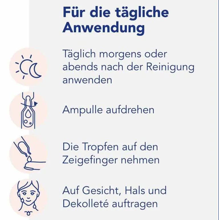 Einfach die Ampulle aufdrehen, die Tropfen mit dem Zeigefinger entnehmen und täglich morgens oder abends nach der Reinigung auf Gesicht, Hals und Dekollete auftragen.