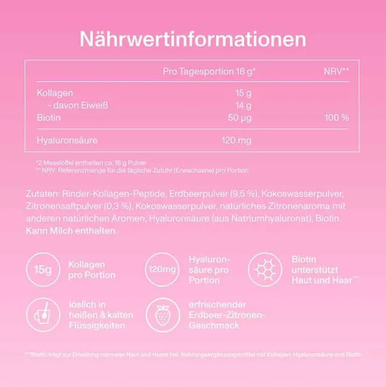 Rinder-Kollagen-Peptide, Erdbeerpulver (7,5 &), Inulin, Aroma, Zitronensaft (2,4 %), Kokoswasserpulver, Hyluronsäure (aus Natriumhyaluronat), Biotin.