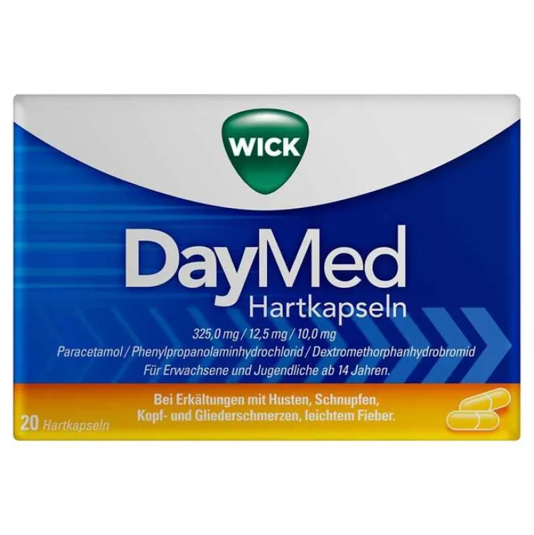 WICK DayMed Hartkapseln Anwendungsgebiete: WICK DayMed Hartkapseln sind eine Kombination aus Schmerzmittel/fiebersenkendes Mittel (Analgetikum/Antipyretikum), Hustenstiller (Antitussivum) und Sympathomimetikum. WICK DayMed Hartkapseln werden angewendet bei: Erkältungskrankheiten mit Husten, Schnupfen, Kopf- und Gliederschmerzen, leichtem Fieber. Warnhinw.: Arzneimittel für Kinder unzugänglich aufbewahren. Ohne ärztlichen Rat nicht länger anwenden als in der Packungsbeilage vorgegeben! Zulassungsinhaber: Abanta Pharma GmbH, Reichsstraße 78, 58840 Plettenberg. Pharmazeutischer Unternehmer: WICK Pharma Zweigniederlassung der Procter & Gamble GmbH D-65823 Schwalbach am Taunus. Stand: Juni 2024 Zu Risiken und Nebenwirkungen lesen Sie die Packungsbeilage und fragen Sie Ihre Ärztin, Ihren Arzt oder in Ihrer Apotheke