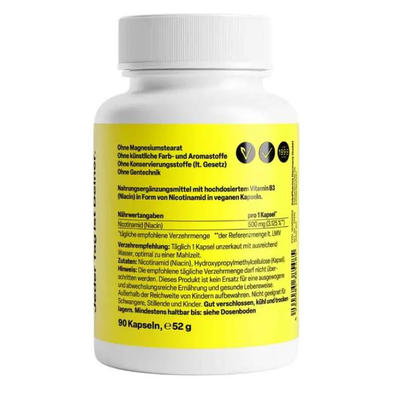 - Vitamin B3 trägt zum gesunden Energiestoffwechsel, zur Erhaltung gesunder Haut und Schleimhäute, zur normalen Funktion des Nervensystems und zur Verringerung von Müdigkeit und Ermüdung bei
